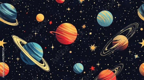 Abstract spaceinspired designs, seamless repeat, cosmic and artistic, illustration seamless pattern fabric, no blur, photo not dark, everything is clear, copy space