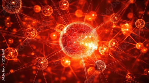 Abstract spheres representing data nodes, forming an atom-like structure in a glowing 3D neural network concept.