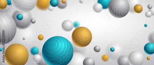 Abstract spheres vector background, composition of flying balls decorated with lines, 3D mixed realistic globes, realistic depth of field effect.