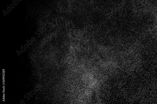 Abstract splashes of water on black background. Freeze motion of white particles. Rain, snow overlay texture.