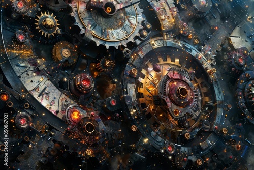 Abstract steampunk clockwork background with intricate gears and glowing orbs.