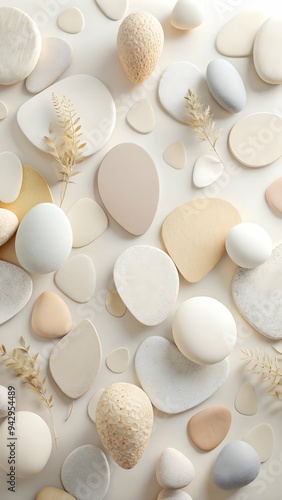 Abstract Stone Pattern: A minimalist, calming arrangement of smooth, rounded stones in various shades of beige and white, creating a serene, natural texture.