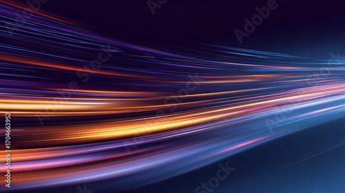 Abstract streaks of vibrant purple orange and yellow light trails flowing across a dark background creating a sense of speed and motion