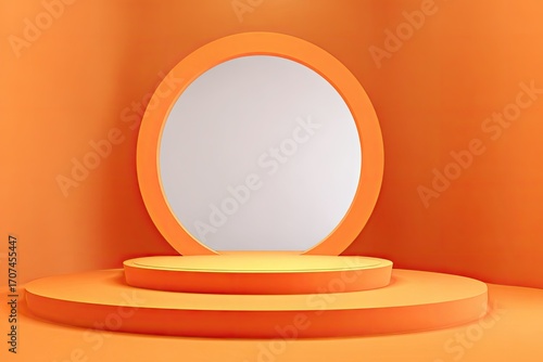 Abstract Studio Set in Warm Orange Tones Featuring Round Podium and Oval Backdrop for Product Display and Presentation with Minimalist Design Elements