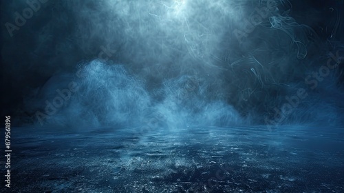 Abstract studio with smoky asphalt floor, dark blue street, and thunderstorm