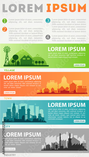 Abstract stylish cityscape infographics. Infographics elements collection with town, city, farm and industrial districts