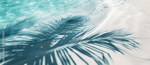 Abstract summer vacation concept banner featuring a palm leaf shadow on a white sandy beach, with sunlight dancing on the water surface.