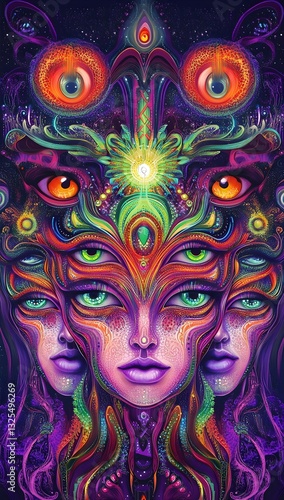 abstract Surreal shapes dance in vibrant mystery. Eyes, hearts, magic vibes. spirit world concept. psychedelic or trippy art wallpaper.
