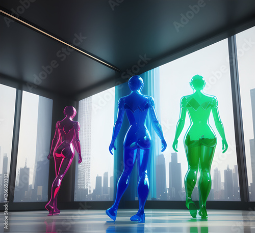 Abstract surrealistic illustration of glass statue several people standing in pose.Concept project.mindfulness and meditation.Futuristic. cyberpunk.innovation different types of poses.generative ai