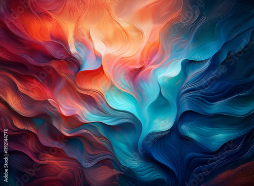 Abstract swirling artwork with vibrant hues of red, orange, and blue. The dynamic, flowing forms create a sense of depth against a dark background.