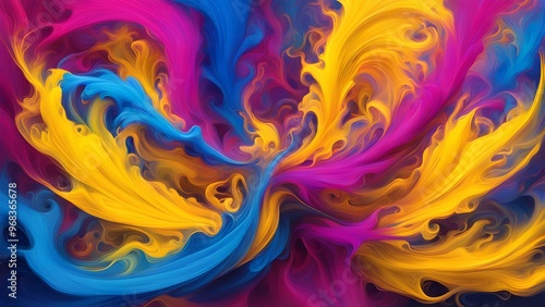 Abstract swirling background with vibrant colors of blue, yellow, and magenta.