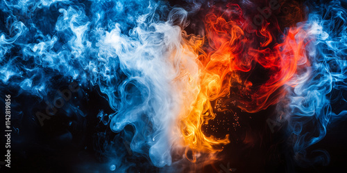 Abstract swirling blue and red smoke with fiery orange center on a dark background