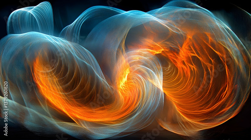 Abstract swirling energy, fiery hues, dark background, digital art, website header