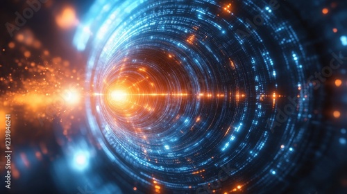 Abstract swirling light tunnel, blue and orange hues. Ideal for tech, data, or futuristic concepts.