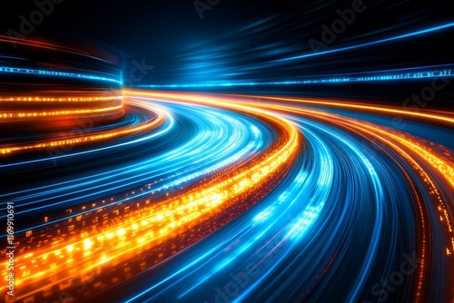 Abstract swirling motion blurred light trails, glowing orange and blue circular pattern.