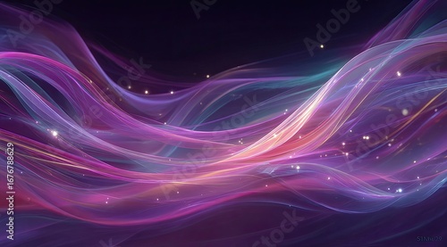 Abstract swirling ribbons of light in shades of purple, pink, and teal, with shimmering particles