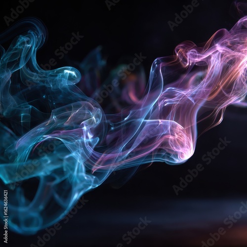 Abstract swirling smoke creates a mesmerizing pattern of colorful wisps and ethereal gradients against a dark background, suggesting mystery and fluidity.
