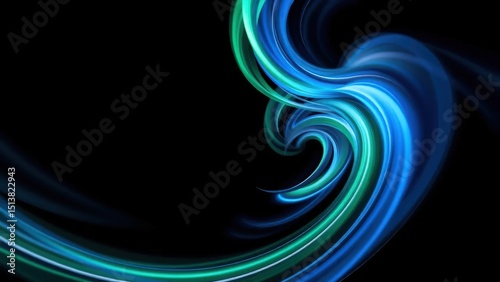 Abstract swirling vortex of blue, green, and white lines on a black background