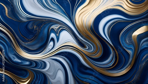 Abstract swirls of blue, white, and gold create a luxurious, fluid design.