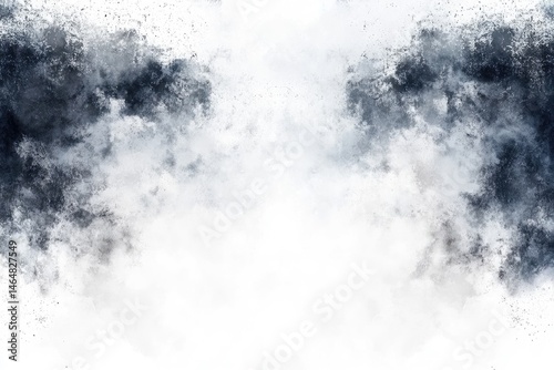Abstract, symmetrical, dark gray and white splatter painting on a white background. A central blank space is created by the splatter