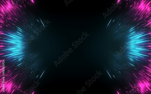 Abstract symmetrical light streaks, pink and blue glowing lines on black background, copy space.