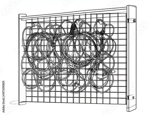 Abstract tangled cables on a grid. Industrial design, monochrome sketch.