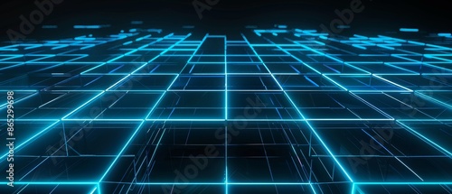 Abstract tech background featuring a dense square grid with neon blue lines on a dark background, creating a futuristic look