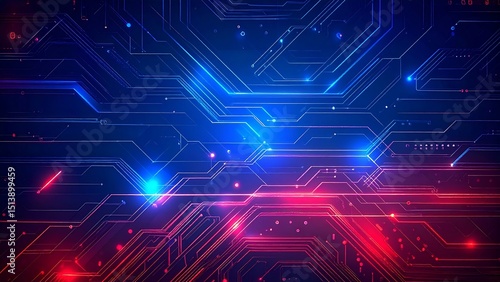 Abstract technology background featuring illuminated circuits in vibrant shades of blue and red glow