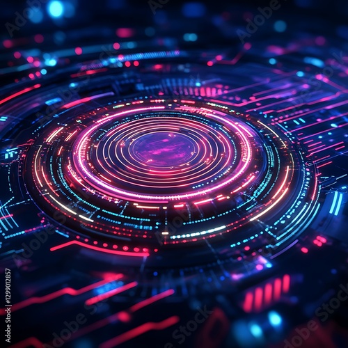 Abstract technology background with glowing circles and lines in vibrant blue pink and purple colors