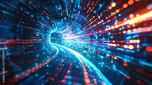 Abstract technology futuristic glowing blue and red light curved lines with high-speed effect on dark blue background.