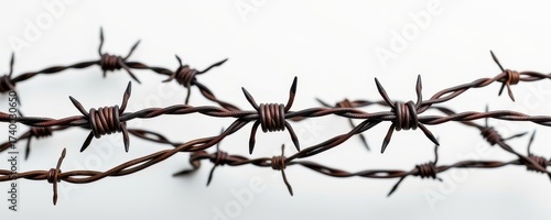 Abstract three strands of barbed wire isolated on white background, sharp points, tangled, metallic texture, grunge, industrial, illustration, points
