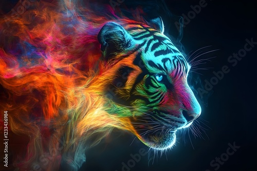 Abstract tiger face, side view, formed entirely from swirling smoke and flickering fire