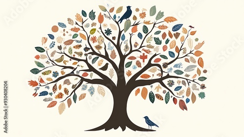 Abstract Tree with Birds and Fall Leaves - Colorful Autumn Illustration.