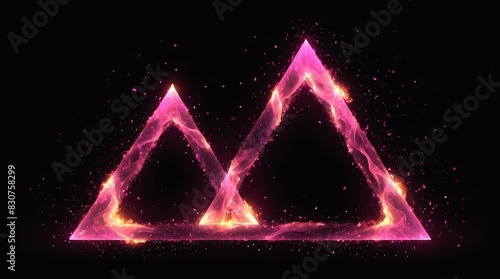 abstract triangle of pink glowing light particles with fire flame on plain black background