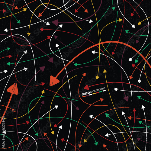 Abstract vector background with dynamic multicolored arrows and chaotic lines on black textured surface. Concept of data flow, technology, movement, or communication.