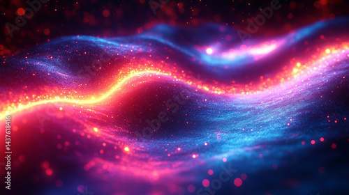Abstract vibrant glowing wavy lines of red and blue particles.
