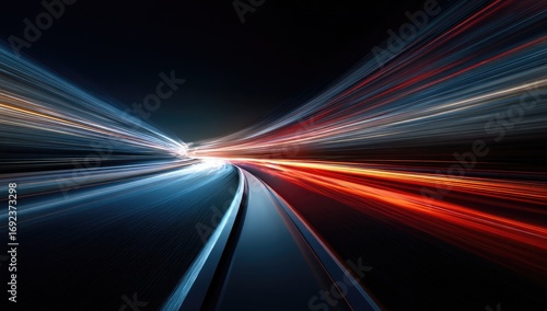 Abstract, vibrant streaks of light converging in a tunnel. Fast motion blur creates dynamic effect