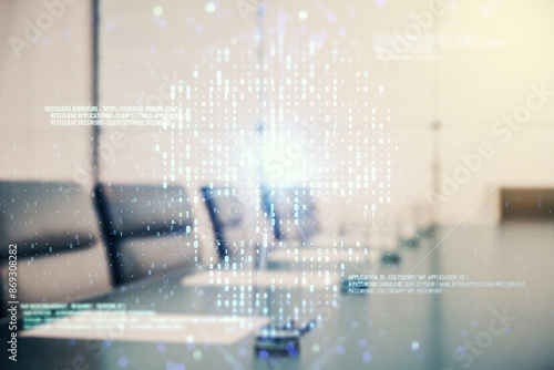 Abstract virtual code skull hologram on a modern coworking room background, cybercrime and hacking concept. Multiexposure