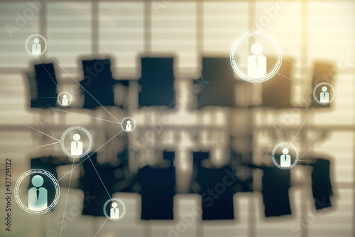 Abstract virtual social network concept on a modern conference room background. Multiexposure