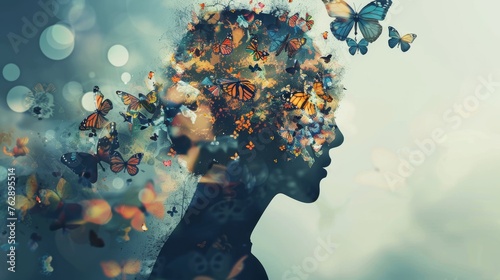 Abstract visualization of a human silhouette breaking into a swarm of butterflies, symbolizing transformation and personal growth