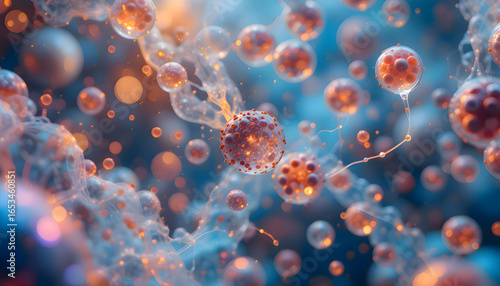 Abstract visualization of glowing microscopic particles resembling molecules in a vivid scientific background, symbolizing chemistry and nanotechnology.