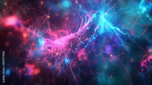 Abstract visualization of neural network connections with vibrant pink and blue lights.