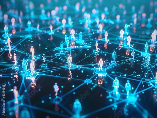 Abstract visualization of social network connections with digital human figures on a glowing blue grid. Concept of technology and communication.