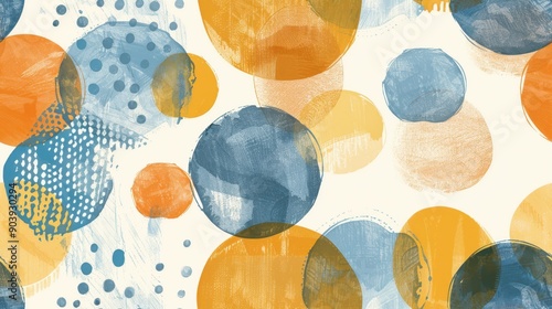 Abstract watercolor circle seamless pattern with blue, orange, and yellow circles on a white background. Ideal for artistic, creative, and decorative designs.