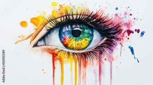 abstract watercolor illustration of Human eye close up with colorful paint , ink splashes and drips, Generative AI,