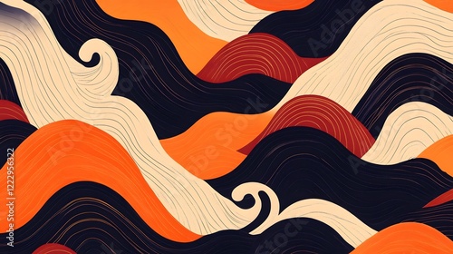 Abstract wave pattern design, vibrant orange and earth tones swirling together, perfect for modern art or textile applications.