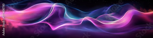 Abstract wave, vibrant neon colors, flowing energy, cosmic background, purple and blue hues, dynamic motion, digital art, surreal landscape, glowing particles, futuristic design, smooth curves, ethere