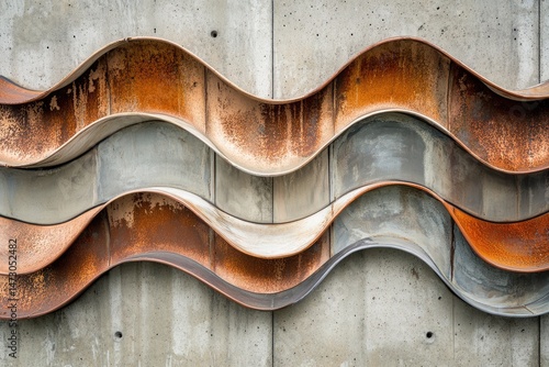 Abstract wave-like metal panels mounted on a concrete wall. Oxidized copper and gray metal panels form a wavy design