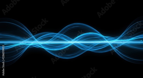 Abstract waves, glowing blue lines, intertwining curves, black background, digital art, neon effect, flowing energy, dynamic composition, futuristic design, ethereal light trails, smooth gradients, te