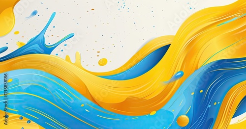 Abstract waves of blue and yellow create a dynamic, vibrant background.